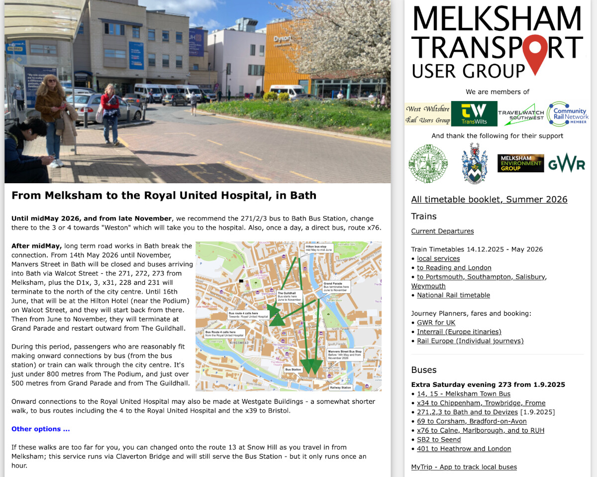 The RUH is the main major hospital for Chippenham, Corsham, Melksham, Bradford-on-Avon and Trowbridge and the Wiltshire Council bus team are aware of the issue and we have messaged about it. Trowbridge and B-o-A can use the D1 which still goes to the bus station. And you'll note MTUG has a web page that can be updated, and has suggested that people follow us on Facebook where we will update too.