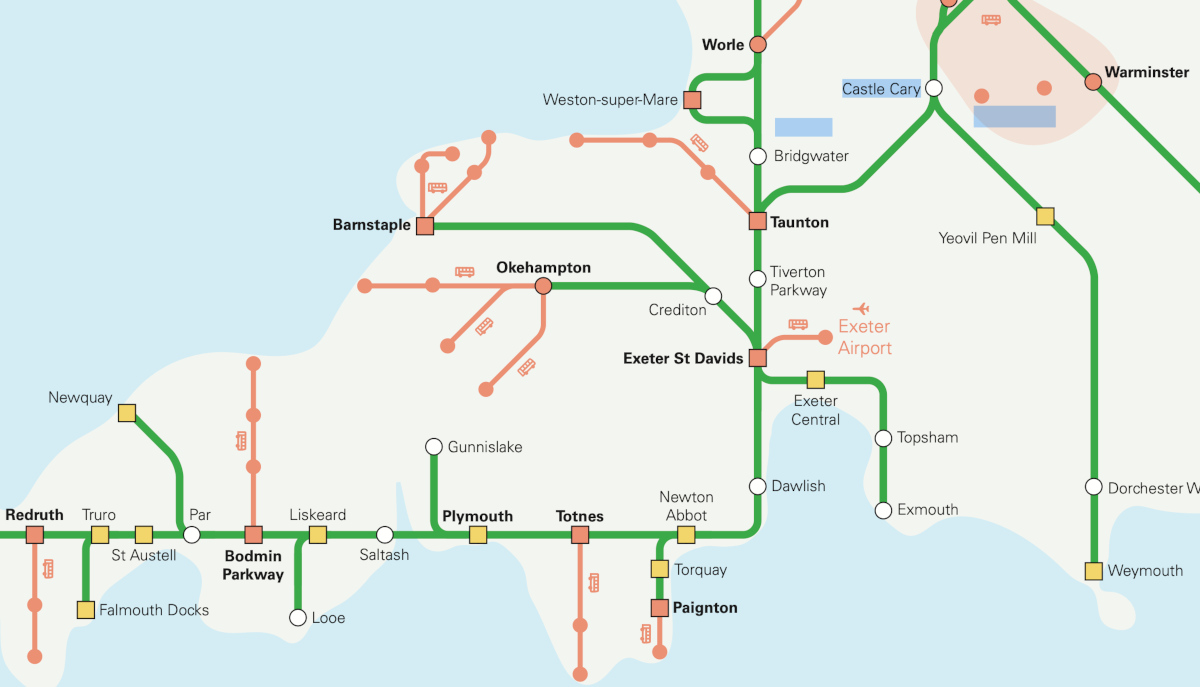 I'll give you a starter of Bude - from GWR's virtual branch lines. Here it is on their integrated bus route map: