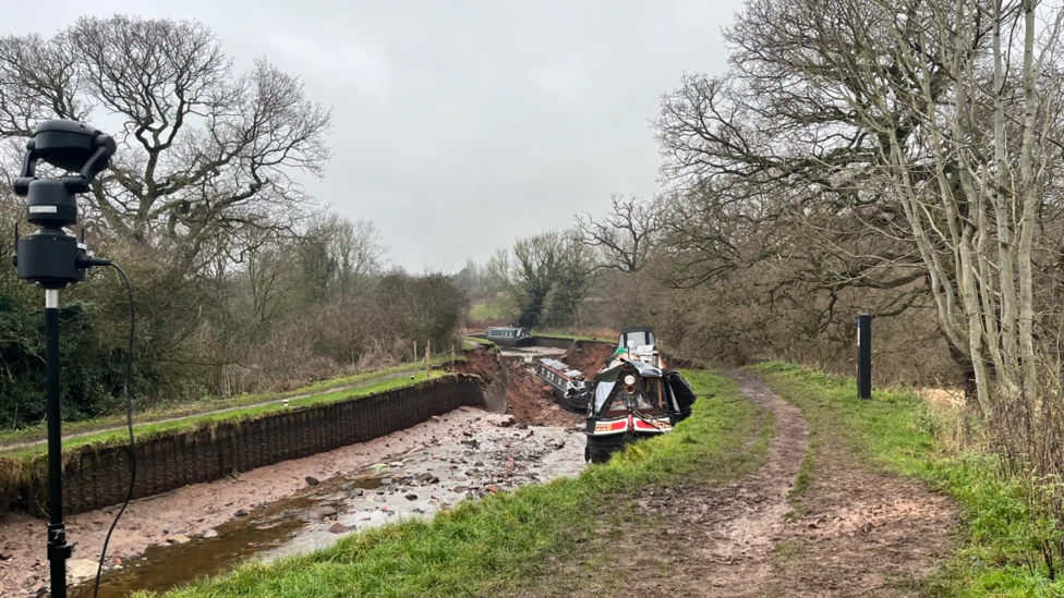 Andy Hall, a councillor in Whitchurch, said: "We've got two boats at the bottom of the sink hole that have fallen down, and we've got two boats that are teetering on the edge that could go in at any time," he told the BBC. "Obviously [the fire service is] going to make those safe." He added: "[People] thought that there was an earthquake. To the right, we've got the field which has taken probably about a million gallons of water out of the canal." He said the fire service had put in a flood gate to stop the flow of more from the compromised waterway.