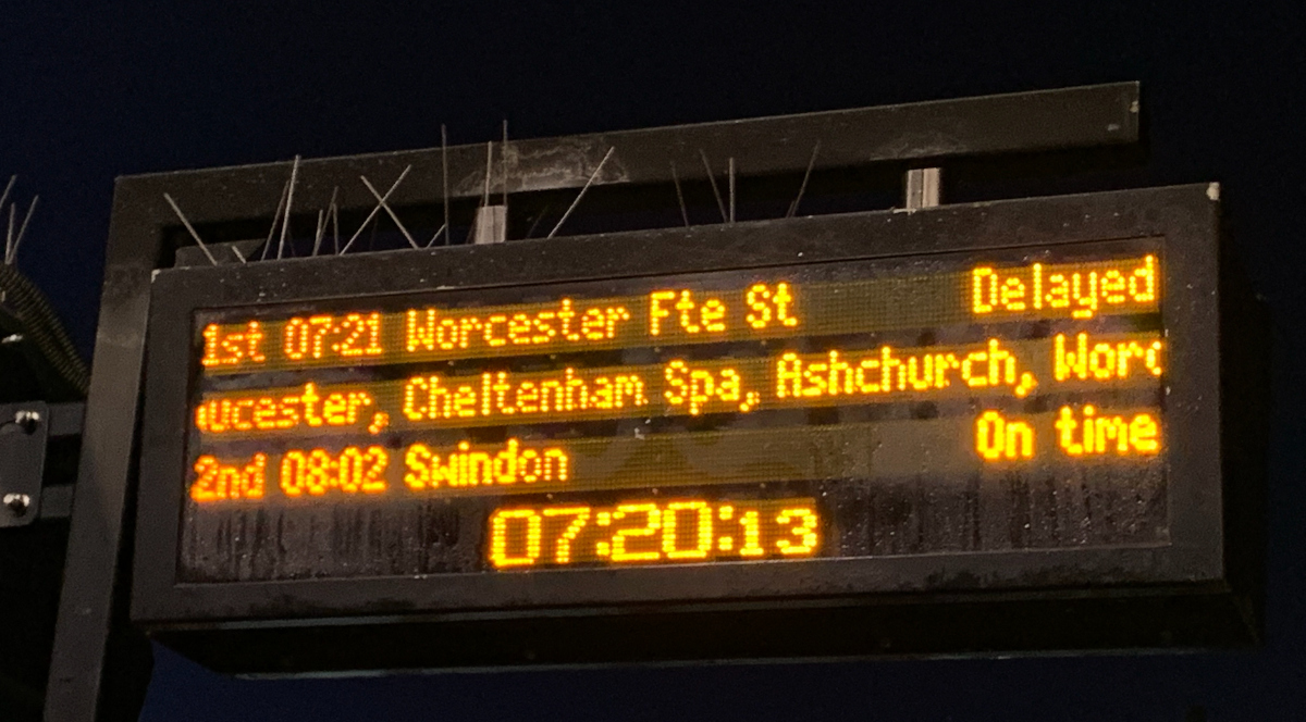 In the end that train didn't reach its intended destination, Worcester Foregate Street. It was terminated at Shrub Hill over 40 minutes late due to a track circuit failure near Cheltenham. It then started its next journey to Bristol Temple Meads 20 minutes late but only got as far as Bristol Parkway.