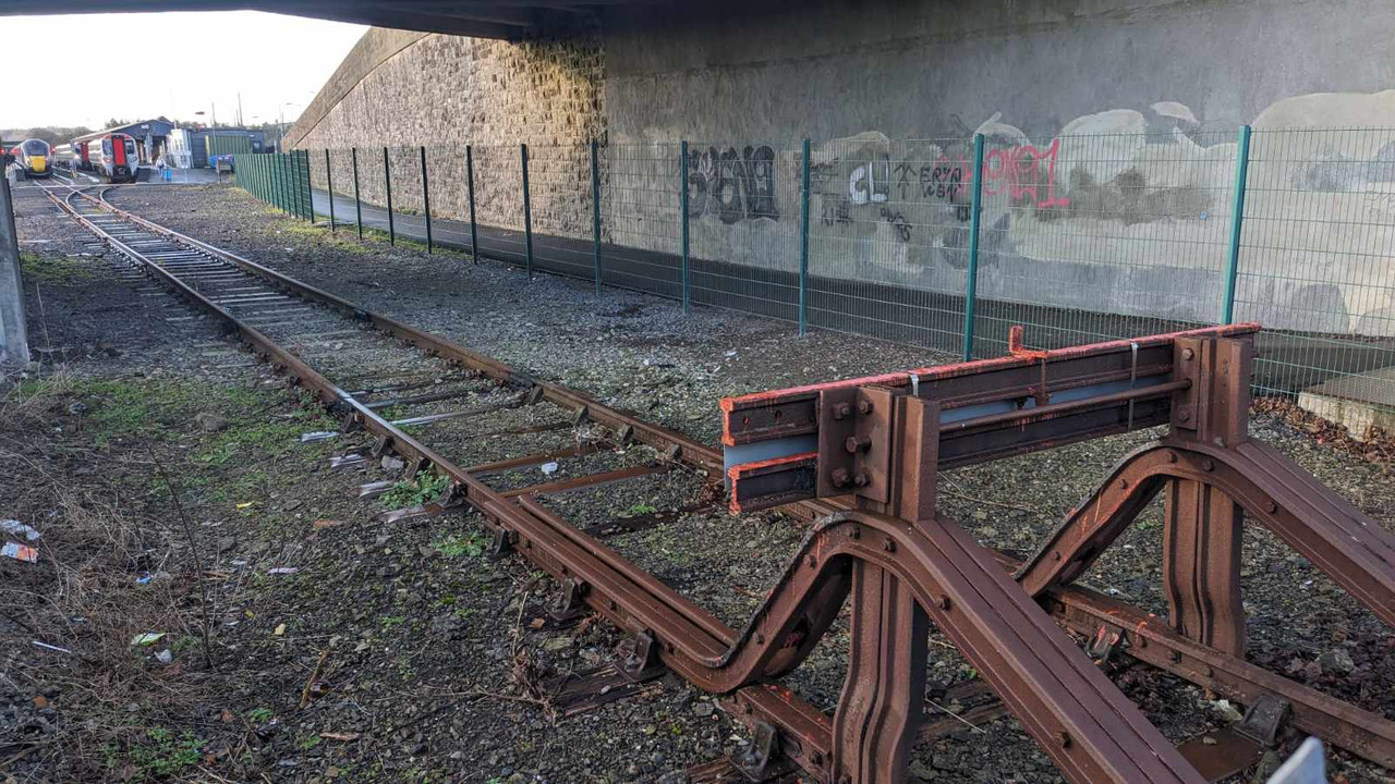 Haha! Bridge: tick. Two lines converge: tick. Buffer stops: tick. Graffiti: tick. A case of "All the right notes, but not necessarily in the right order."