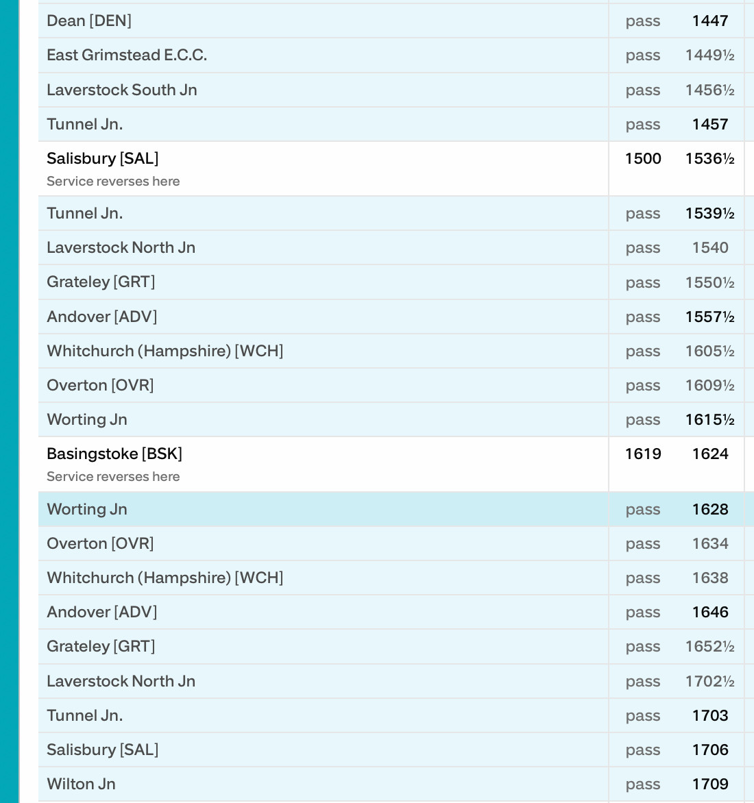 I still can't quite get the timings to work and place the two trains on the junction at once. It's only a couple of minutes, so it may be down to the nature of the timings recorded, or indeed to my sums. The distance from the call at Andover to Salisbury Tunnel Junction is 16m 13ch, and at a steady 90 mph with no call would take 10.9s. Add acceleration time and it's barely possible to get there in 12s (with rounding of times) and the path allowed 15s. Recorded timings at Andover and the junction are 18:30 and (for 1F30) 18:42, so by my reckoning there can't have been much deceleration at all.