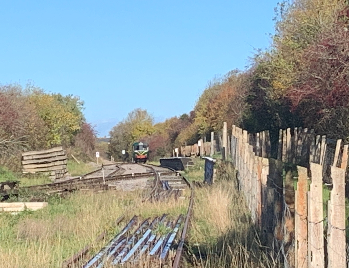 Waymarking leaves something to be desired in places, but a bit of common sense got me to the Tawny Owl, then under it and the track up to the station. Although online I had read that the railbus was running, the gate was locked with feasrsone spikes, signs taled about next trains being 27th and 28th September the Sundays in October and then Santa ... which did not bode well for 2nd November. No-one else around on the track to the station gate, and the time came and went for the train to arrive and it didn't. I was just about to give up ... Plan "B" to follow the old canal. When the railbus appears. I was, I confess, wary it was going to go back with the gate remaining locked, but the guard came down, took the chain off, and threw the entrance open. Phew!