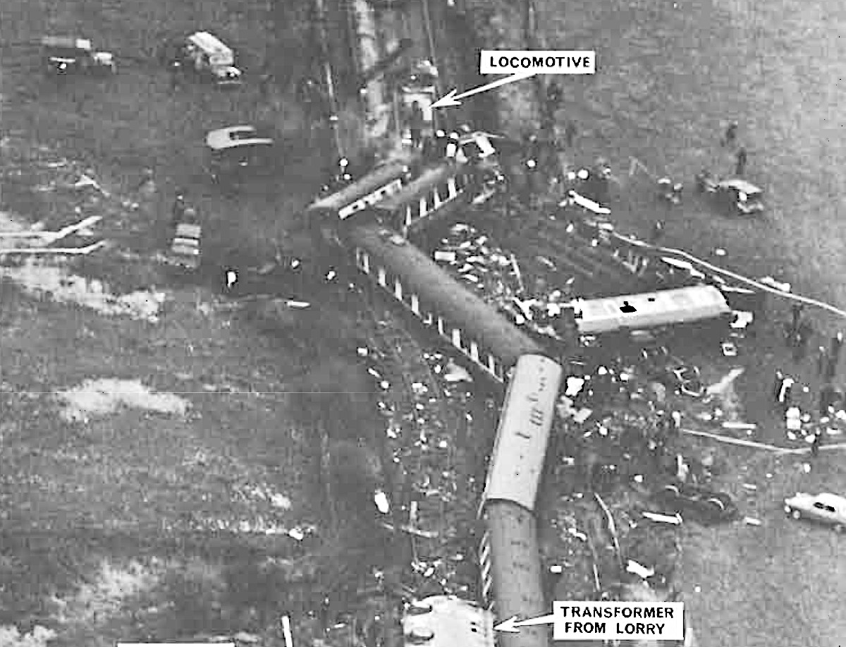 "The basic facts of the tragic accident are not in dispute. At approximately 12.26 p.m. on Saturday the 6th January, 1968, in clear visibility, the 11.30 a.m. Manchester to Euston express, a 12-coach train carrying some 300 passengers and weighing (with its locomotive) 491 tons, running at about 75 miles per hour collided with a heavy road transporter carrying a 120-ton transformer over the automatic crossing. As a result of that collision the train driver, the second man, and a spare driver in the locomotive were killed, and so also were eight passengers in the train. Forty-four passengers and a restaurant car attendant were injured, six of them seriously...